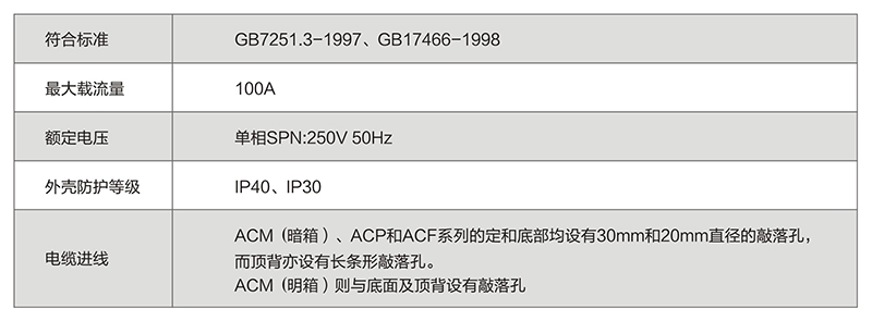 ACM和ACP系列终端配电箱的设计符合GB72513及GB17466标准.箱内配有中性子排、接地端子排及DIN导轨,可配合ABB systemproM终端保护装置.箱体各有6种准规格,分别为8位、10位、13位、16位、20位及23位,每一单极开关各占一位.